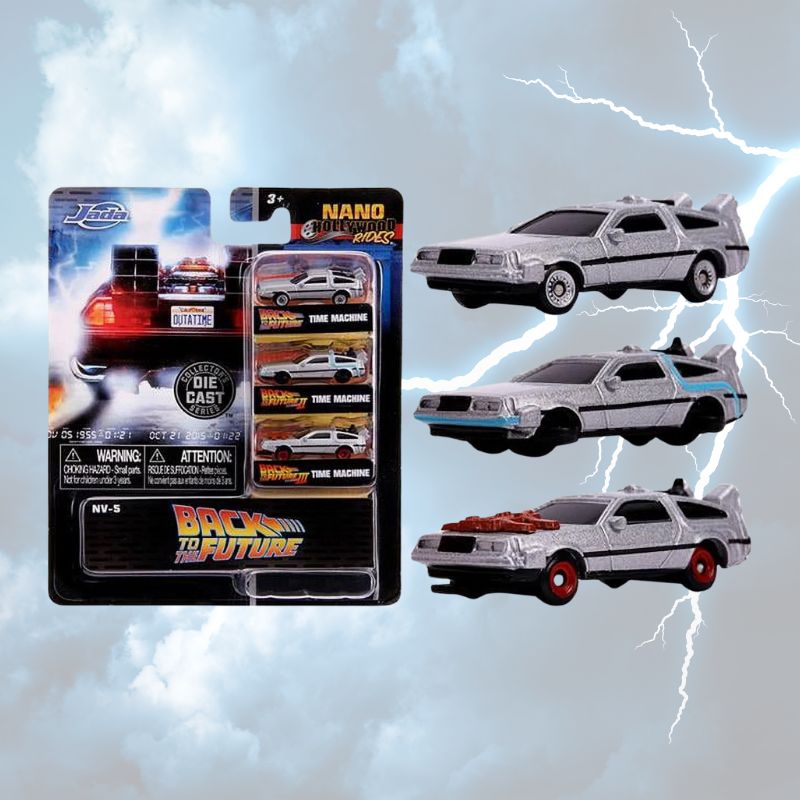 You’re not imagining things—this is real. You’re looking at three miniature DeLoreans packed into one glorious blister pack, because let’s be honest: one tiny time machine just doesn’t cut it. The Nano Hollywood Rides 3-Pack by Jada is here to overload your nostalgia circuits and instantly make your desk, dashboard, or collector shelf about 1.21 gigawatts cooler.